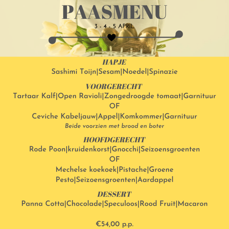 Onze menu's zijn beschikbaar van 3-4-5 APRIL (ZAT-MA)